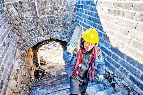 11月21日,工东说念主将从长城左近汇集来的砖块扛上墩台。