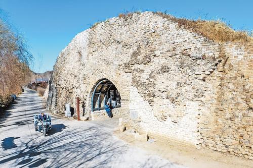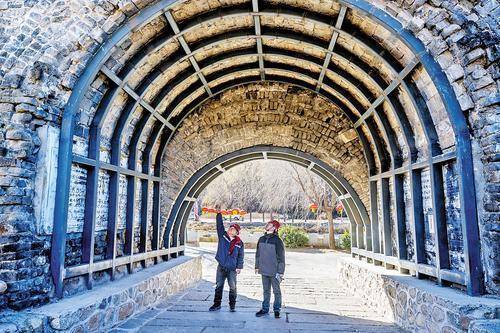 11月19日,界岭口村村民在修缮完成的东月城城门失业。