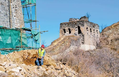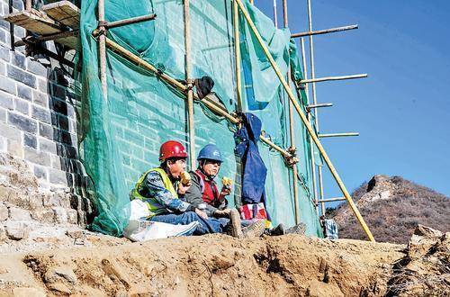 11月19日,工东说念主在长城墩台上搬运修缮物料。