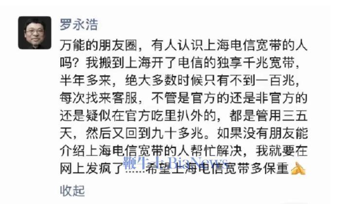 罗永浩吐槽上海电信网速:问题再不搞定,就在网上发疯