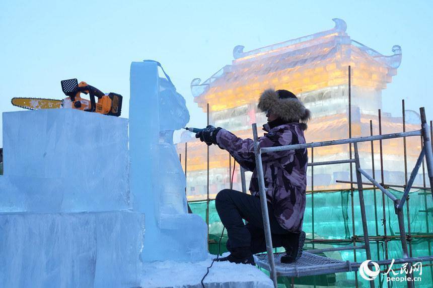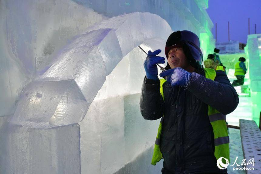 工东谈主正在园区内雕刻冰雕。东谈主民网记者 李洋摄