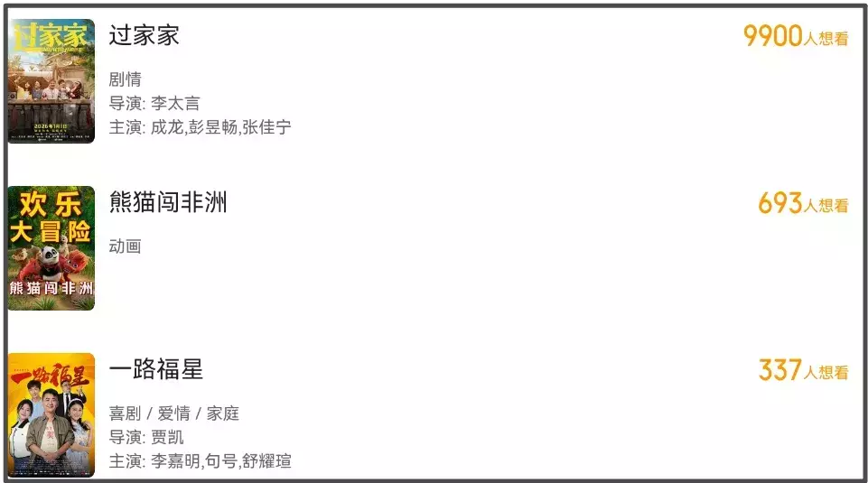 十二部新片刚刚好一天一半,12月31日上6部,1月1日上6部,一天有55岁古天乐主演的《寻秦记》,一天有71岁成龙主演的《过家家》。