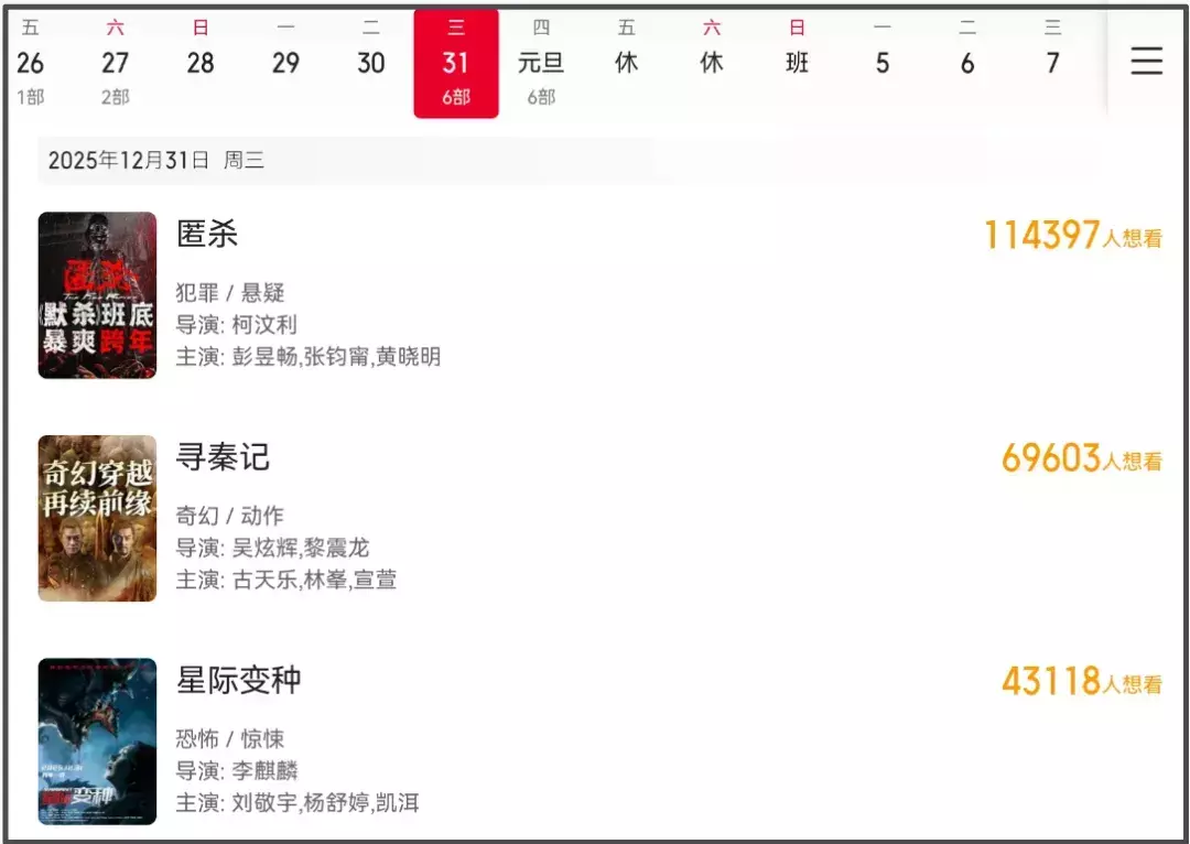 跟着电影《寻秦记》官宣定档12月31日,2025年跨年档已有12部新片上映,追念一下档期关键字,主要有两个,一个是“原班东说念主马”,一个是“情感拉满”。