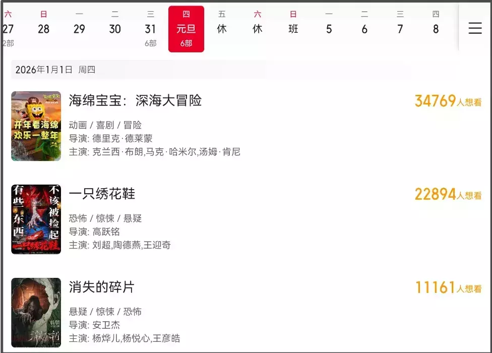 跨年档12部新片数下来,不错说泰半都是无效上映,真实有票房竞争力的不朝上五部,除开一部《海绵宝宝》动画电影,能拿到灵验排片冲击档期冠军的真东说念主片满打满算只可数出四部。
