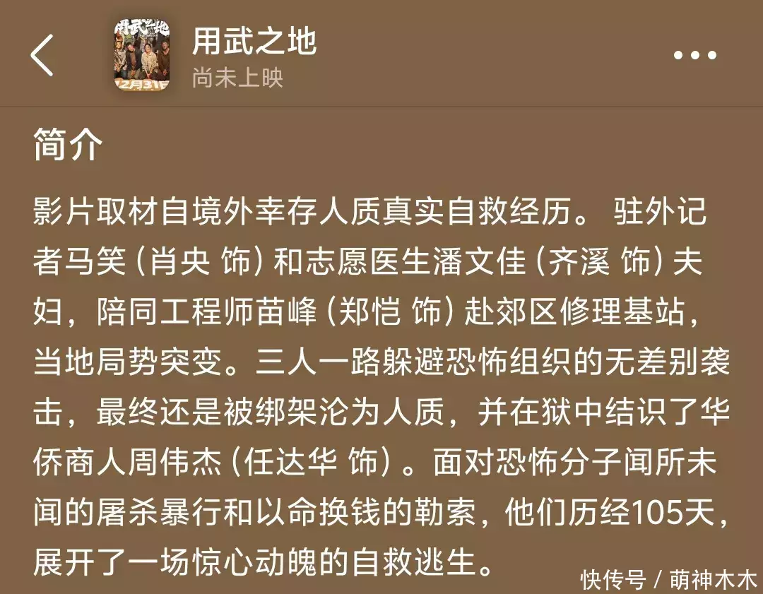 申奥导演的《用武之地》乍一看是唯独一部不卖情感的片子,遵守一看剧情简介,记者、医师、工程师在境外遭受要紧沦为东说念主质,踏实华商自救逃生,大要《作死马医》和《万里归程》杂糅版啊。